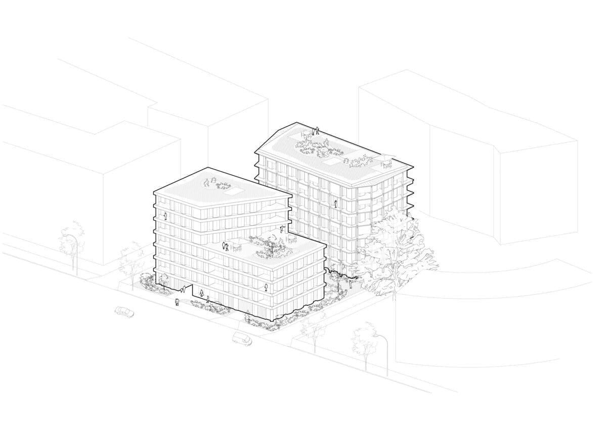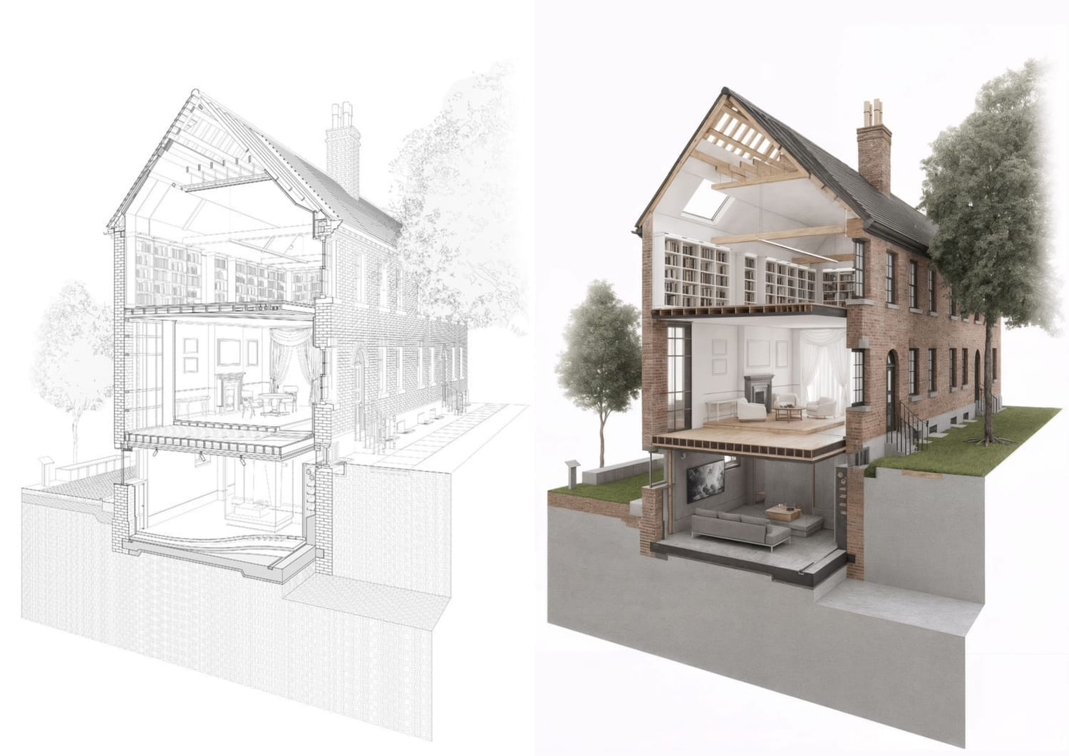 Convertissez une axonométrie, coupe ou élévation vectorielle en image plus illustrative, avec matières et lumière.