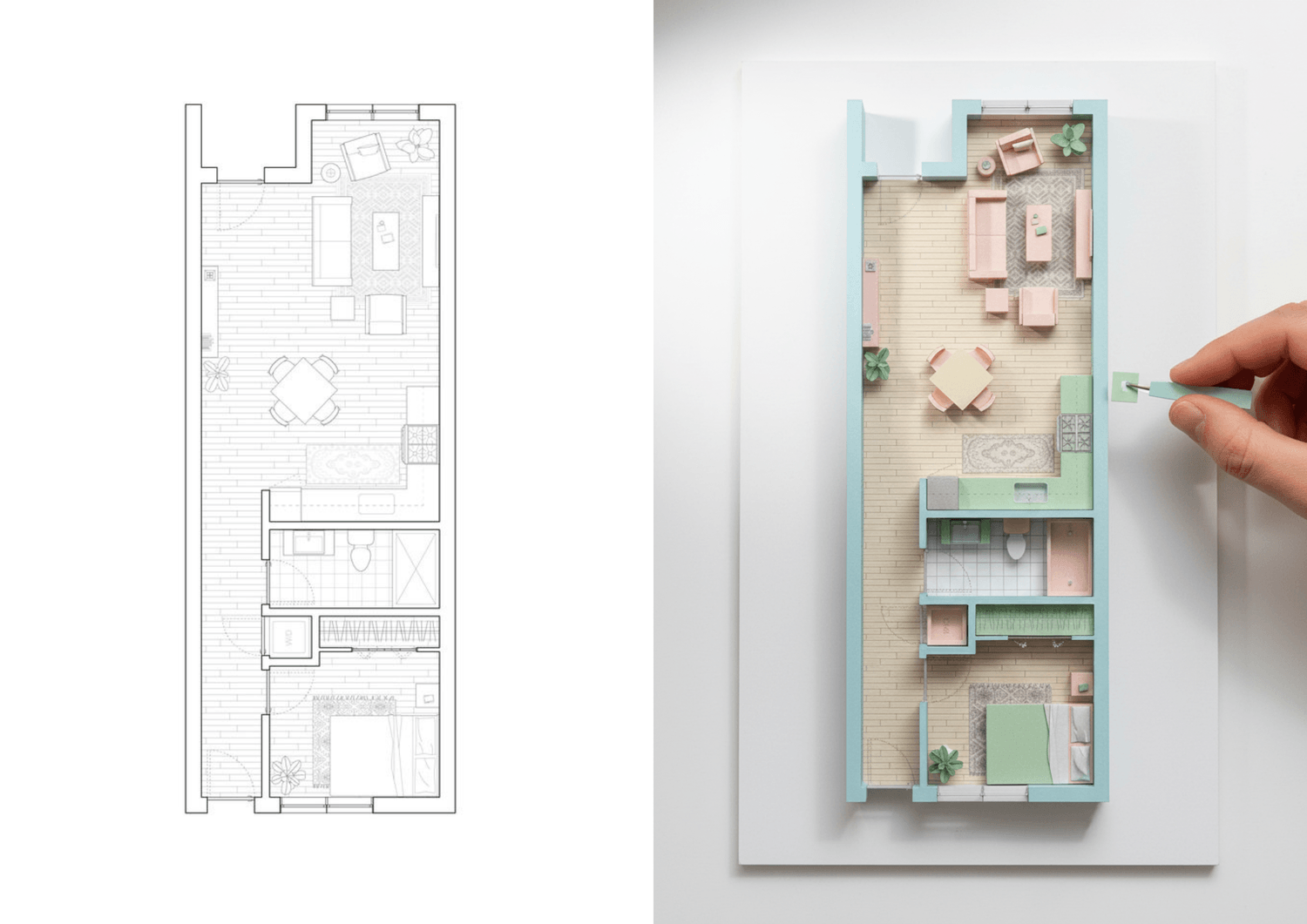Dans ce tutoriel, vous verrez comment convertir un simple plan en une image réaliste de maquette : volumes, matière carton, ombres fines et rendu photographique contrôlé.
